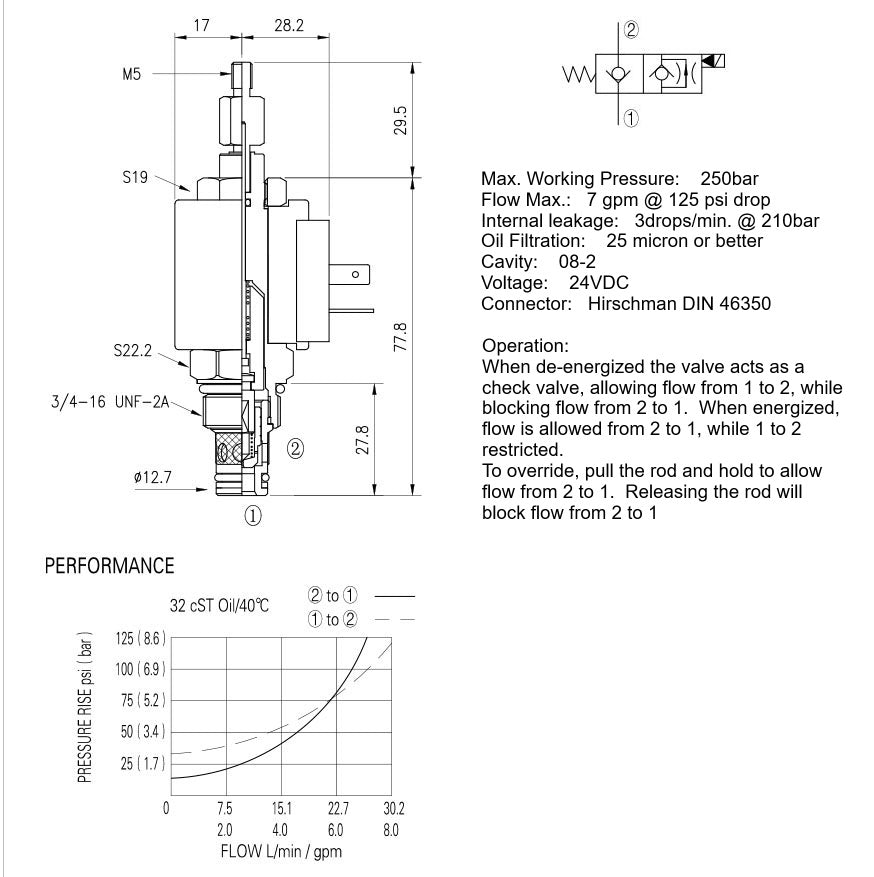 When de-energized flow is blocked in both directions.  When energized the valves poppet opens from its seat, allowing flow from 2 to 1 and 1 to 2.